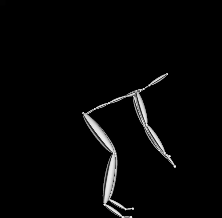 SPLYZA Motionでは、入力した動画ファイルから動作解析を行い、人体のスティックフィギュアを生成するとともに、モーションデータをBVH形式で出力することができます。