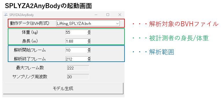 そこで弊社では、保守ユーザー様向けに、SPLYZA Motionで取得したBVHファイルに対応したAnyScriptを自動生成するアプリケーション 「SPLYZA2AnyBody」 をご用意しております。