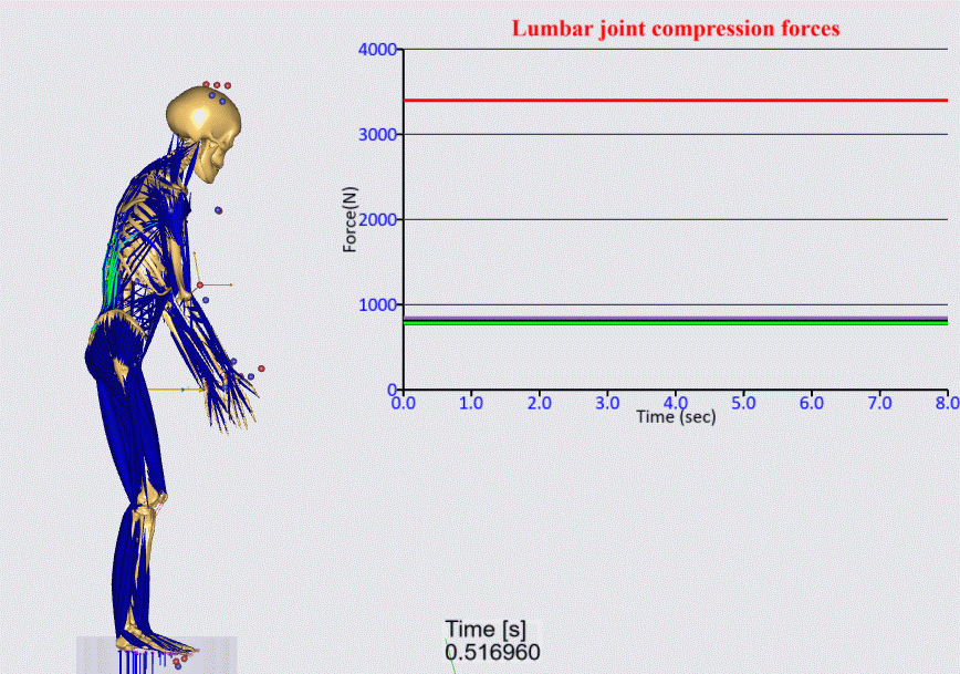 【腰部負担の解析例、画面右のチャートにおける赤線はNIOSHの基準値(3400N)】