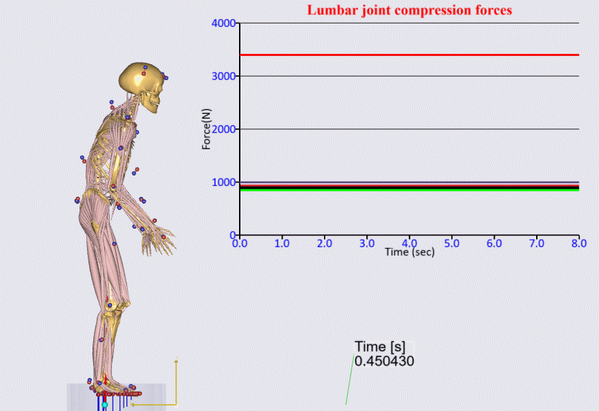 BVH形式のモーションデータは、AnyBodyの筋骨格モデルにおける動作を規定するための入力データとして利用可能です。そのため、SPLYZA MotionとAnyBodyを組み合わせることで動画の動きを人体モデルで再現、解析して、関節反力や筋活動量などの解析結果を算出することが可能です。