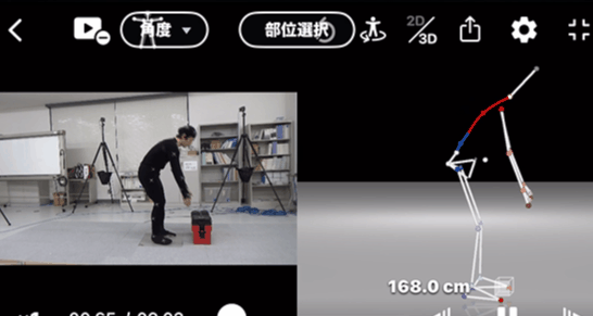 カメラ1台で撮影した動画ファイルを用いて、iOS端末(iPhone/iPad)上でAIによるマーカーレス3D動作解析を行うことができます。