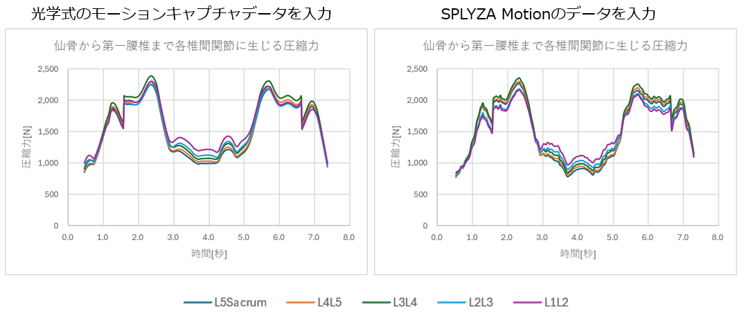 解析結果の一例として、腰椎に作用する圧縮力を評価しました。SPLYZA Motionのデータを用いた解析結果と、光学式モーションキャプチャシステムで取得したデータを比較したところ、ピーク値の大きさおよび値の変動が同等の傾向を示しました。